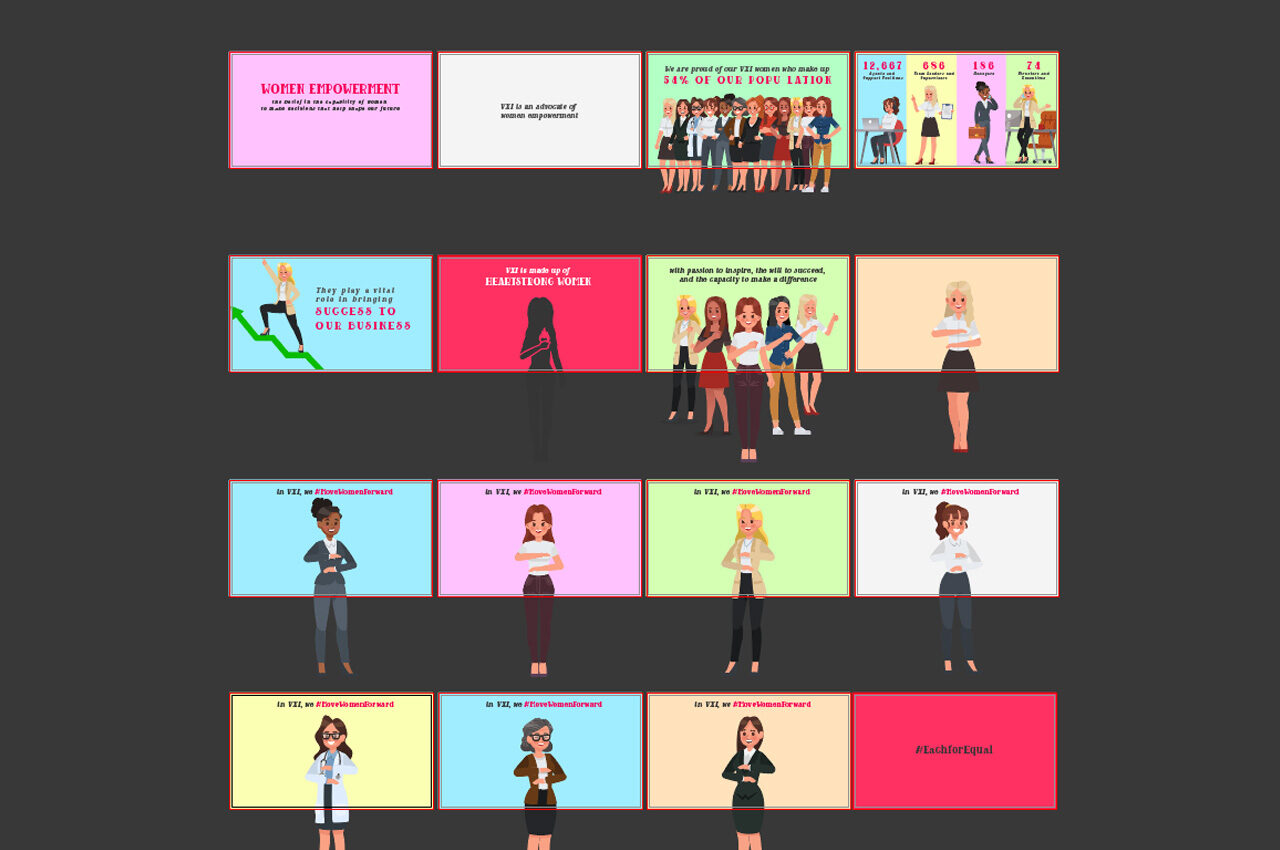 I resourcefully sourced and then heavily modified a library of diverse female illustrations to represent VXI’s global reach and variety of roles (as seen in the storyboard slides ). The animation was designed to rapidly cycle through key statistics—such as the percentage of women in VXI’s workforce and leadership—before concluding with the central theme: “VXI is an advocate of women empowerment”. The final animation successfully delivered a compelling message of inclusion and opportunity.