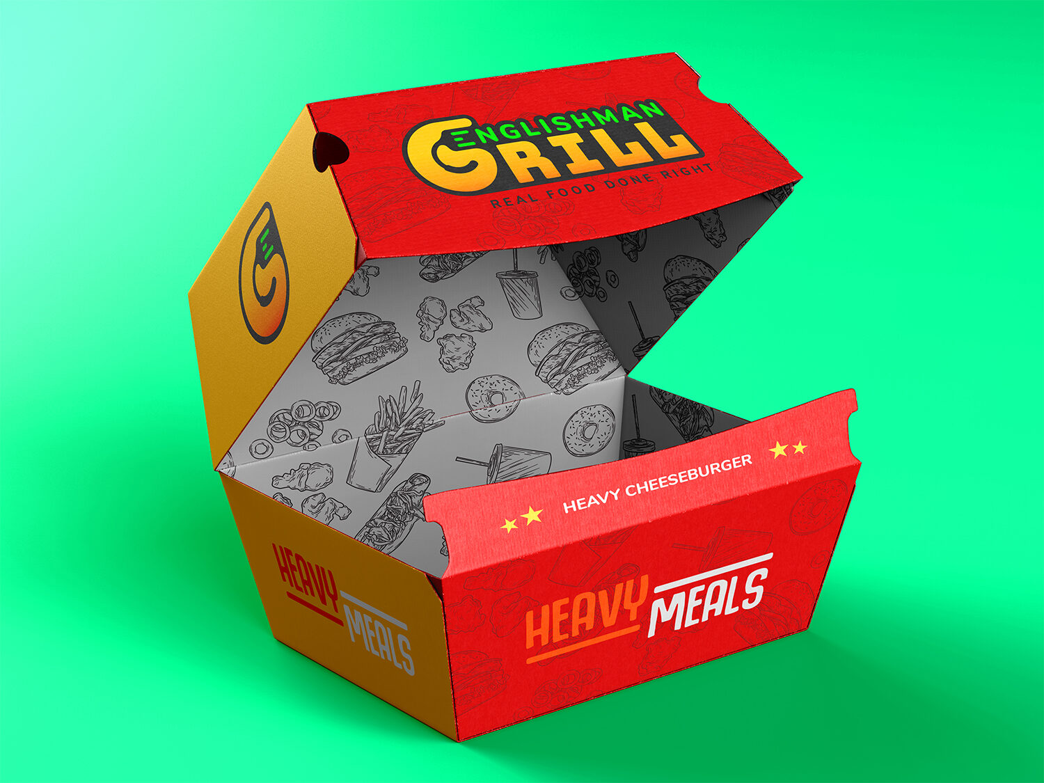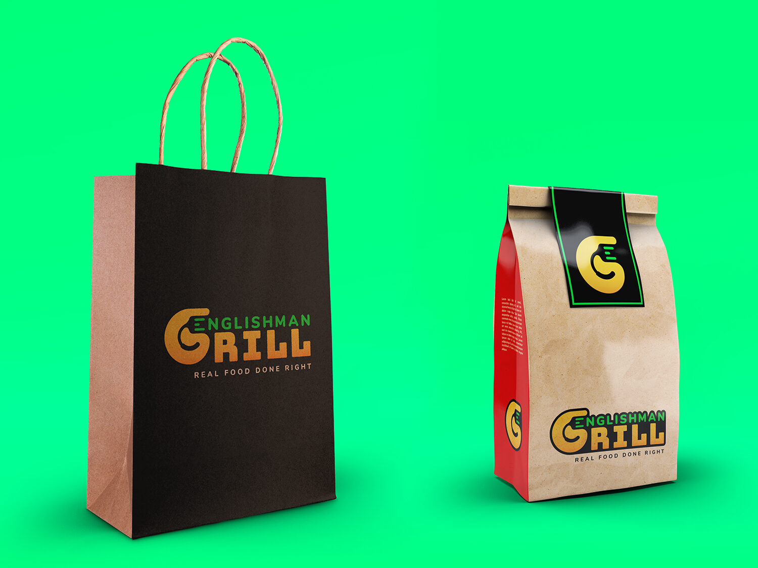 This project delivered the complete visual identity and primary packaging design for Englishman Grill, a new startup restaurant positioned as a premium, post-shift gathering spot. The core assets included a multi-layered logo mark and a high-contrast color strategy applied across signage, packaging, and advertising collateral.